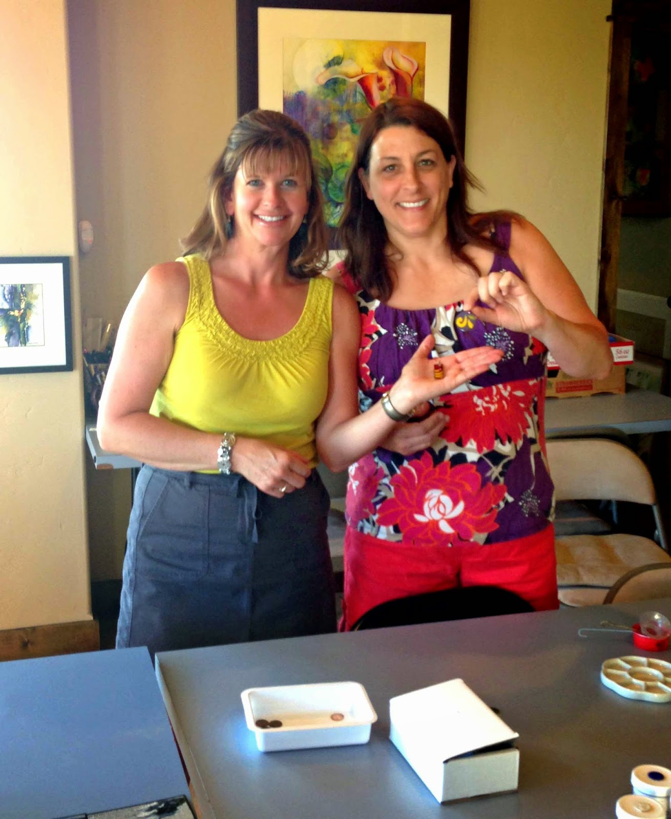 In July, I had the honor of teaching a torch fired enameling jewelry class! My two sisters-in-law came to visit from Oregon, and had the opportunity to create pieces of enameled, wearable art. They had tons of fun and were very successful! They were then able to wear their jewelry home.