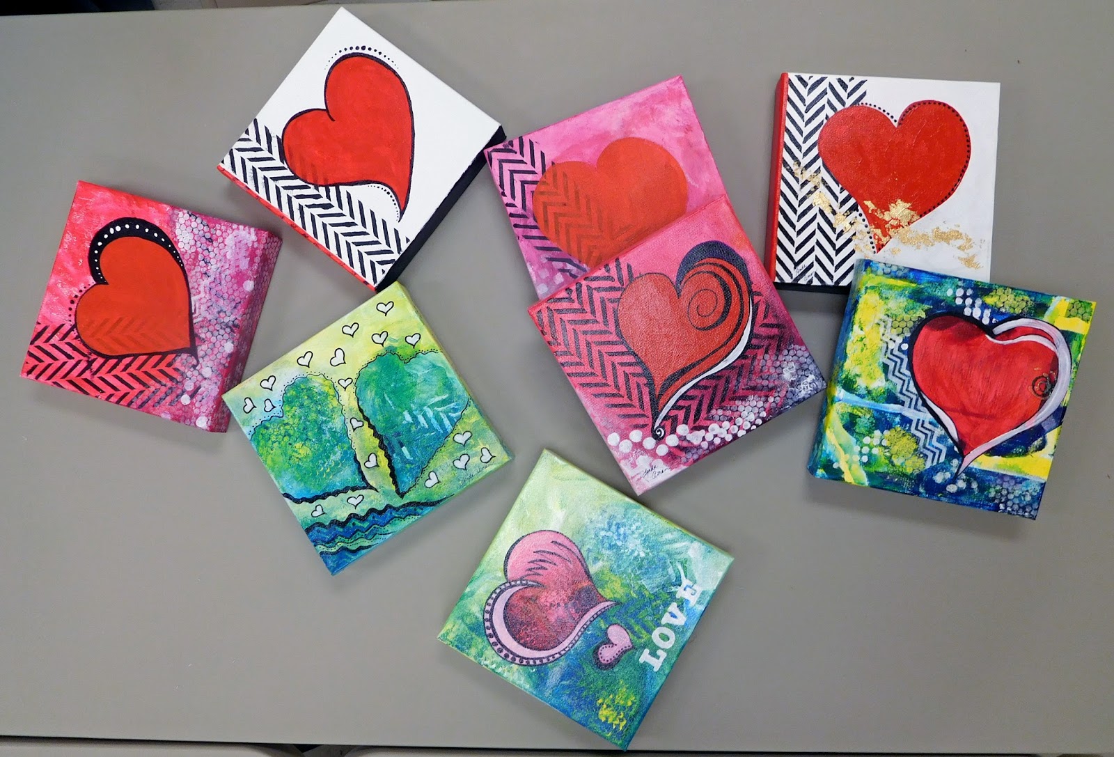 Then, a few days later I arrived back home at my studio in Star, Idaho and thought (somewhat last minute) just because, I would offer the same workshop, and the ladies came out and had a great time creating a mini Valentine’s artwork for their home or a gift!